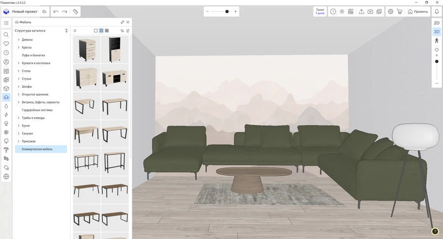 - Библиотека объектов. Встроенный каталог содержит 8000+ моделей мебели и материалов в основном от российских и СНГ-производителей. Любую миниатюру можно масштабировать и перекрашивать. Система позволяет загружать свои объекты в формате OBJ или FBX для полной персонализации.