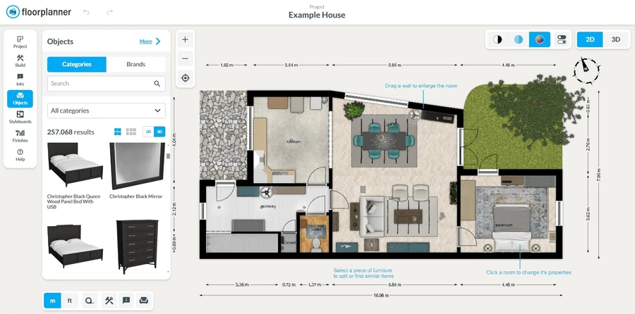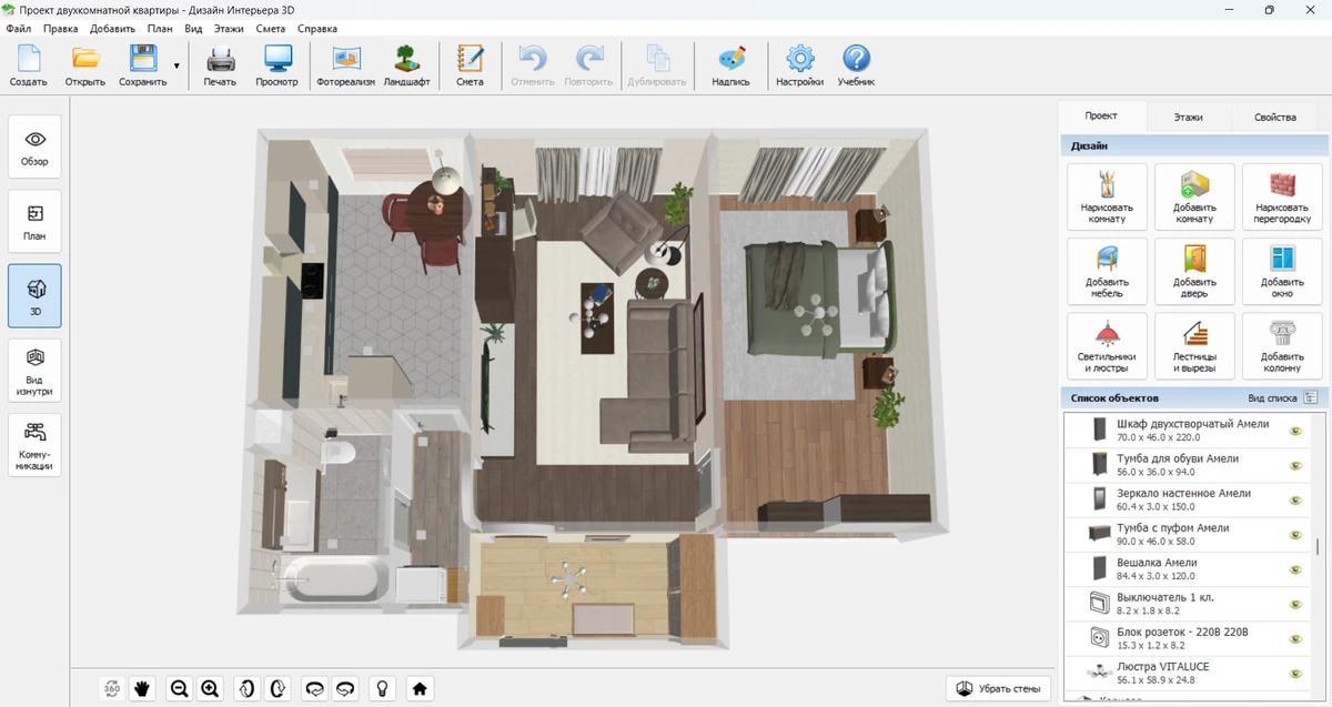 Софт позволяет осмотреть результат проделанной работы со всех сторон. В 2D-режиме вы можете чертить и редактировать помещения, а также расставлять мебель. В 3D-модели удобно выбирать отделочные материалы для стен, пола, потолка и предметов интерьера.