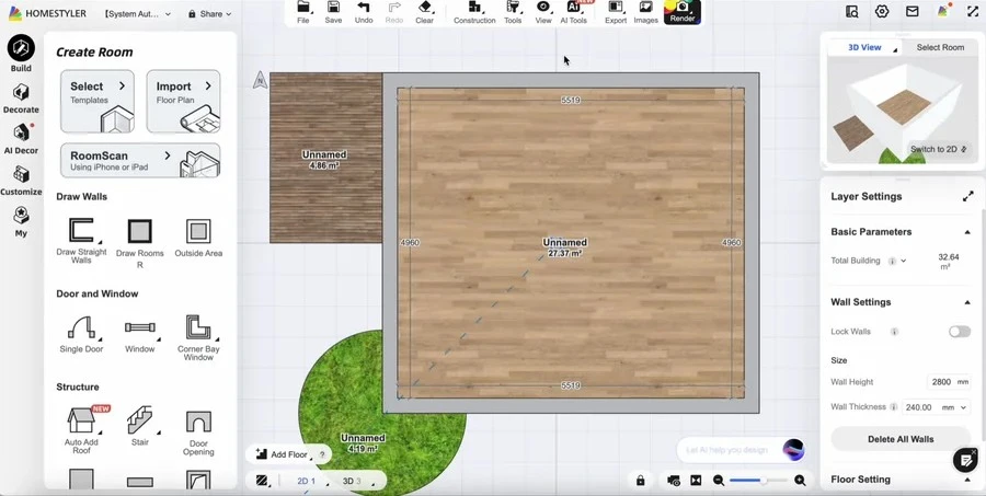 Кроссплатформенный сервис с полной синхронизацией проектов через облако. Его главная фишка — ИИ-генератор интерьеров: вводите текст и получаете готовый 3D-проект. Каталог содержит 7000+ реальных предметов с точными размерами и брендами. Однако эти магазины недоступны в России. Премиум-подписка открывает 4K-снимки, HD-рендер и весь каталог.