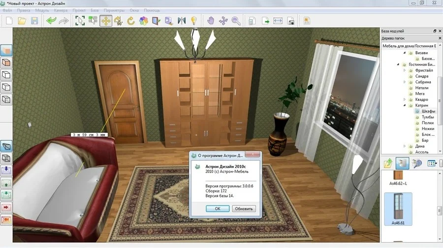 Бесплатная программа от мебельной компании «Астрон», предназначенная для самостоятельного создания 3D-проектов квартир и отдельных комнат. В них можно расставить предметы интерьера и аксессуары из актуального каталога производителя. Результат отображается в трехмерном виде. Готовый проект можно отправить в салон, и менеджер рассчитает точную стоимость всего заказа.