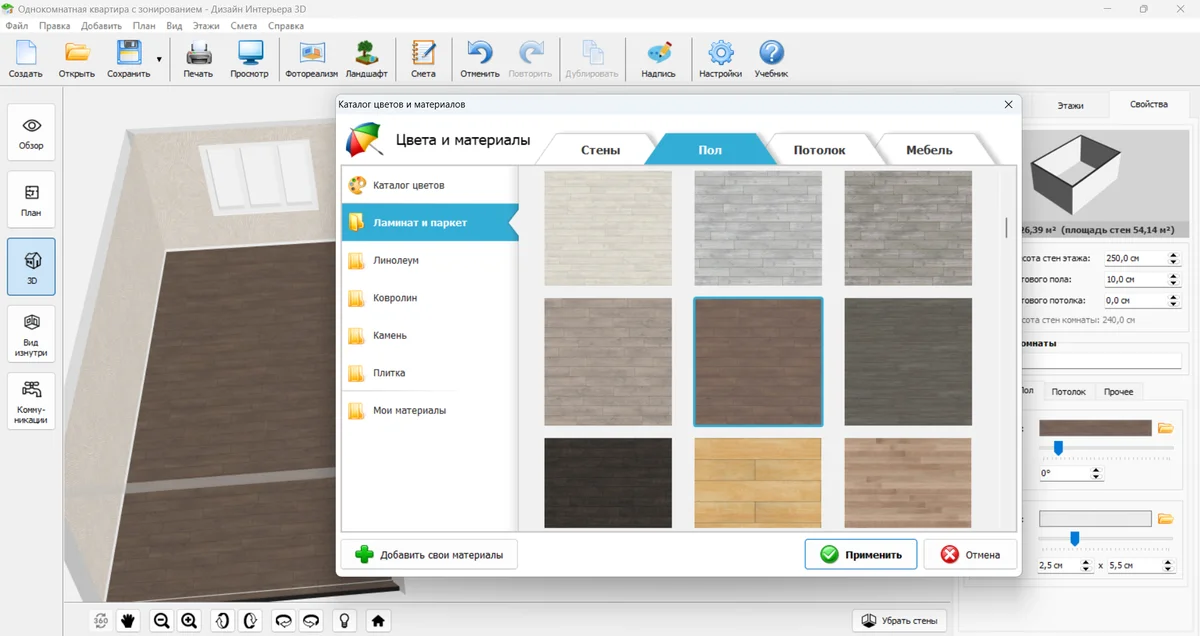 Перейдите в режим обзора и кликните по комнате, чтобы настроить отделку. В Дизайне Интерьера 3D есть каталог на 1200 реалистичных текстур. Он удобно разбит на категории.