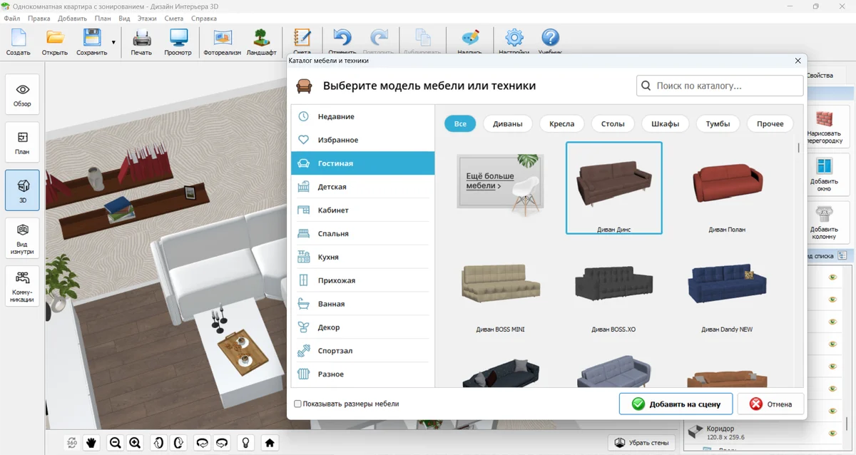 Кликните дважды на объект, чтобы изменить его текстуру: в каталоге материалов есть ткани для обивки, дерево, стекло, металл для фурнитуры и поверхностей.