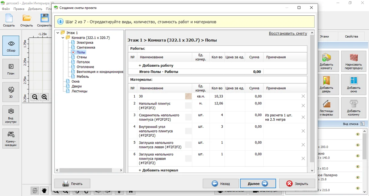 Также смета дает возможность заранее выбрать более выгодные варианты: заменить дорогой материал, убрать ненужные элементы или перераспределить бюджет между зонами. В программе Дизайн Интерьера 3D для этого есть отдельная функция. Узнайте, как рассчитать расходы на ремонт с ее помощью.