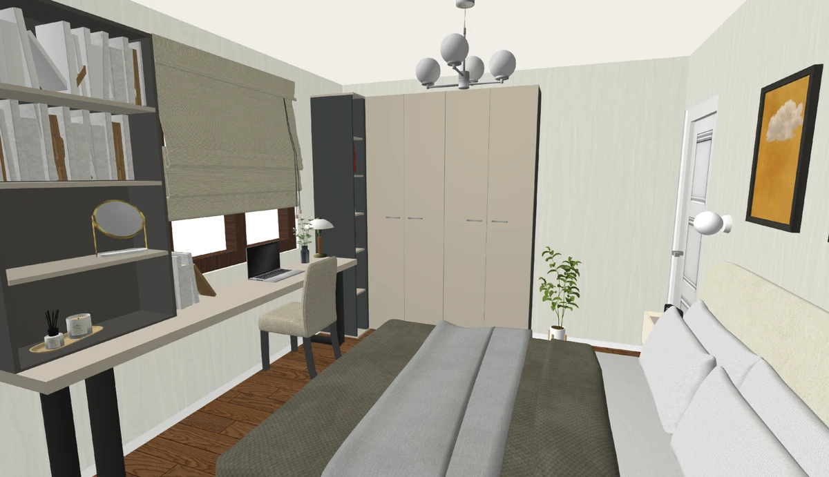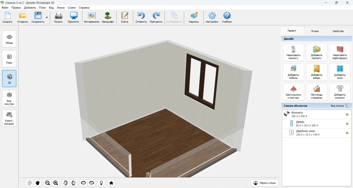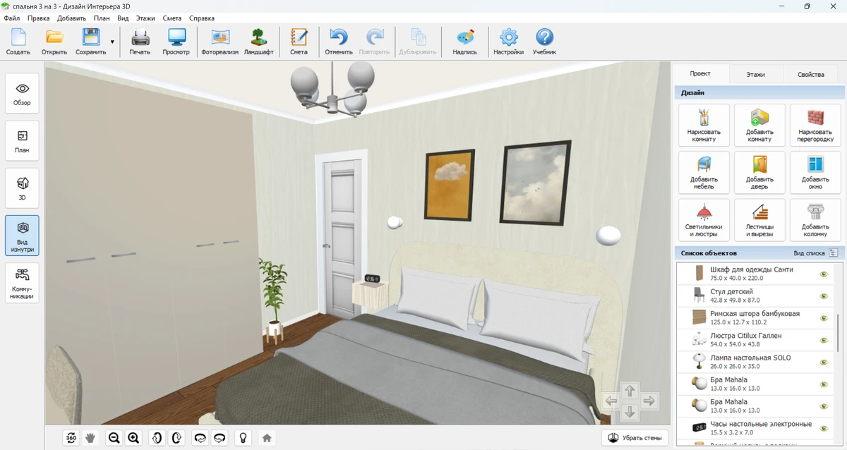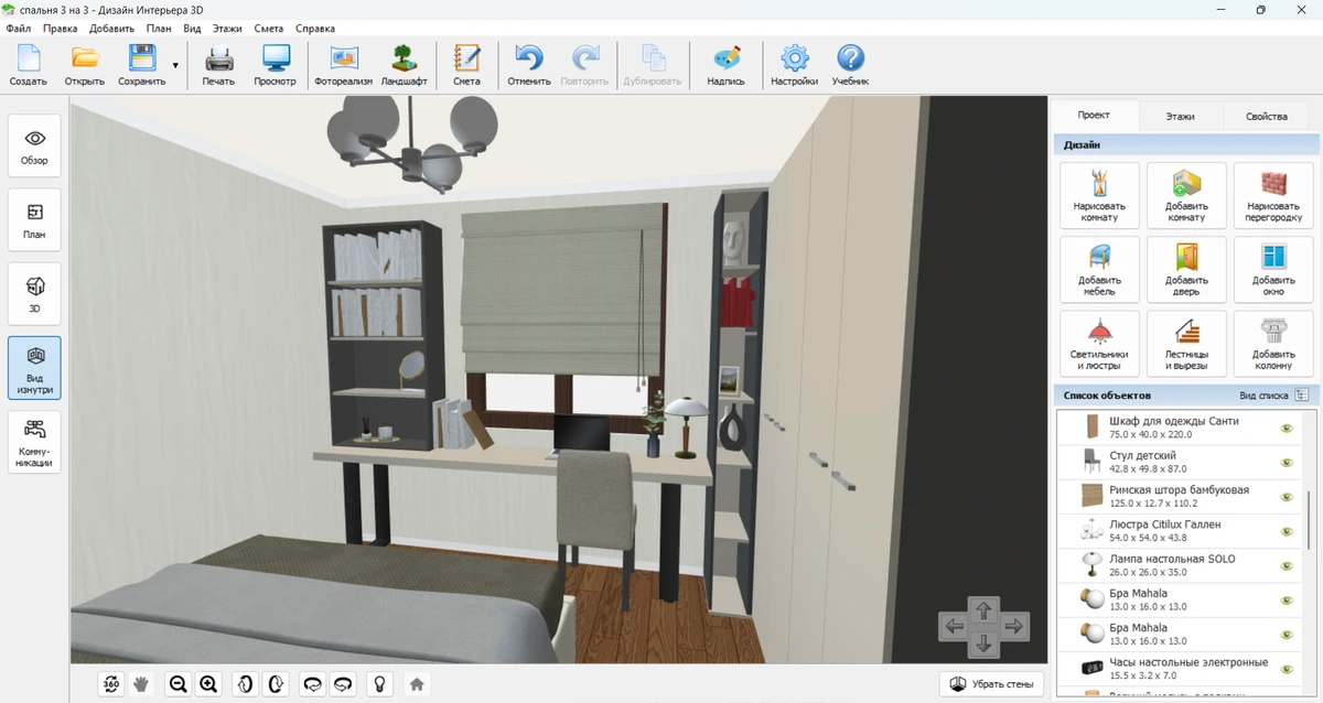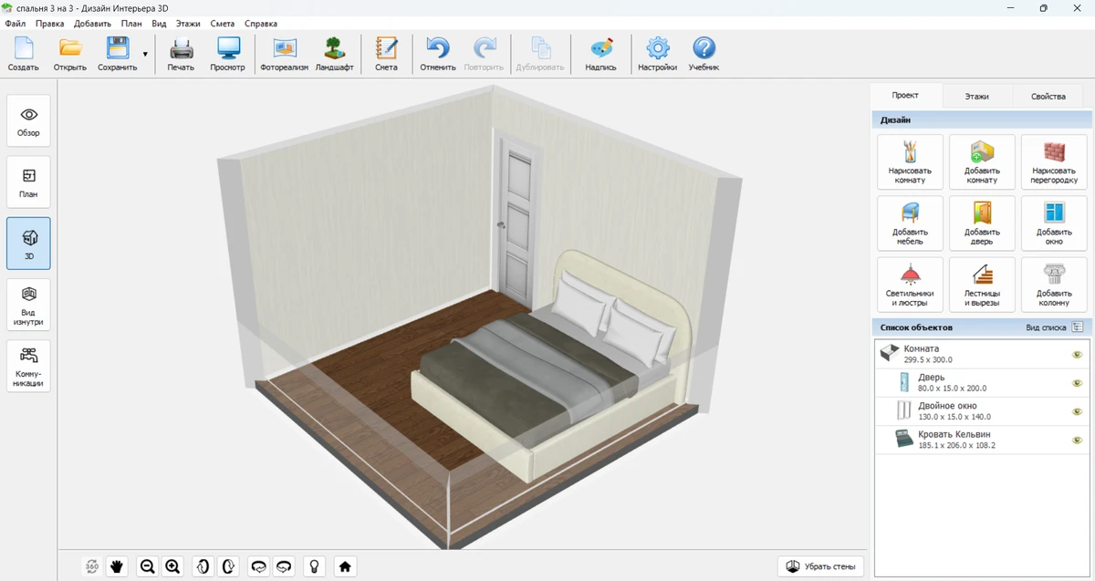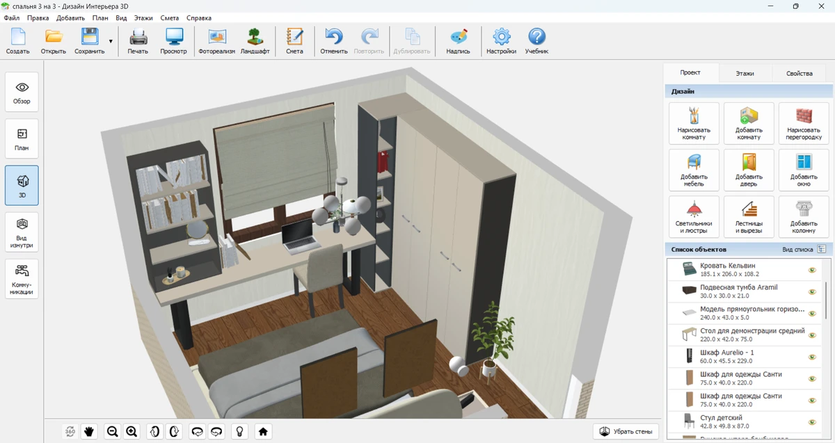 Мысленно или на бумаге сложно оценить пропорции и удобство перемещения. Надежнее всего создать планировку спальни 3 на 3 в программе, например в Дизайне Интерьера 3D. Вы увидите реалистичную 3D-визуализацию. Она поможет заметить потенциальные проблемы, которые не видны на чертеже: узкие проходы между мебелью или недостаток света.