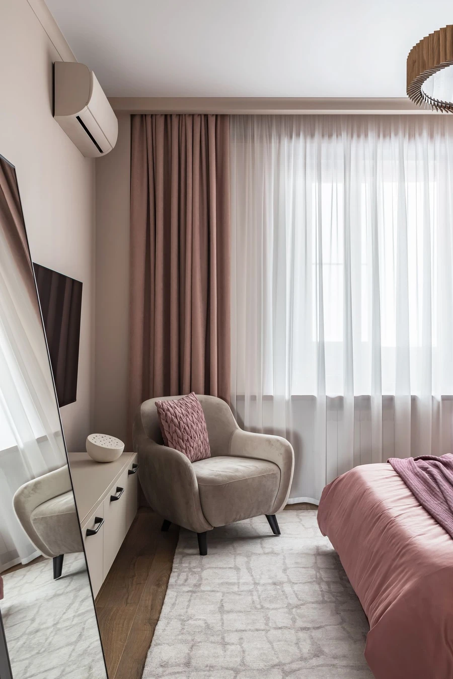 Очень важно оставлять минимально допустимые проходы. Можно сократить количество функций комнаты — например, откажитесь от отдельной макияжной зоны, перенесите ее в ванную или объедините с рабочим столом. Часто оптимальным решением становится изготовление мебели на заказ.