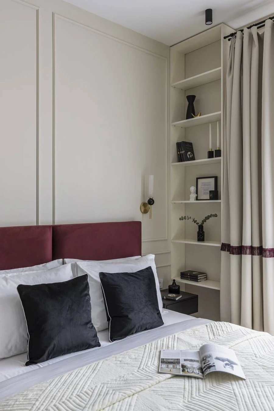 Для создания акцента можно добавить более насыщенный цвет на одной стене, например за изголовьем кровати. Это зрительно вытянет пространство. О том, как использовать сложные оттенки, читайте в статье про дорогие цвета в интерьере. Также для стен подойдут обои с вертикальным рисунком или деревянные панели, которые «поднимут» потолок.