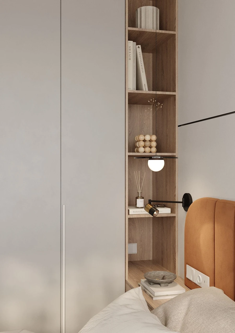 Главное в маленьких пространствах — это избегать визуального шума: чем больше предметов в помещении, тем более захламленным оно выглядит. А наша задача — добавить простор в небольшие объемы комнаты, чтобы она выглядела больше. Поэтому минимизируйте открытые полки, добавляйте больше закрытого хранения, не используйте полностью открытые стеллажи. Лучше сделать стеллаж с комбинацией открытых и закрытых полок.