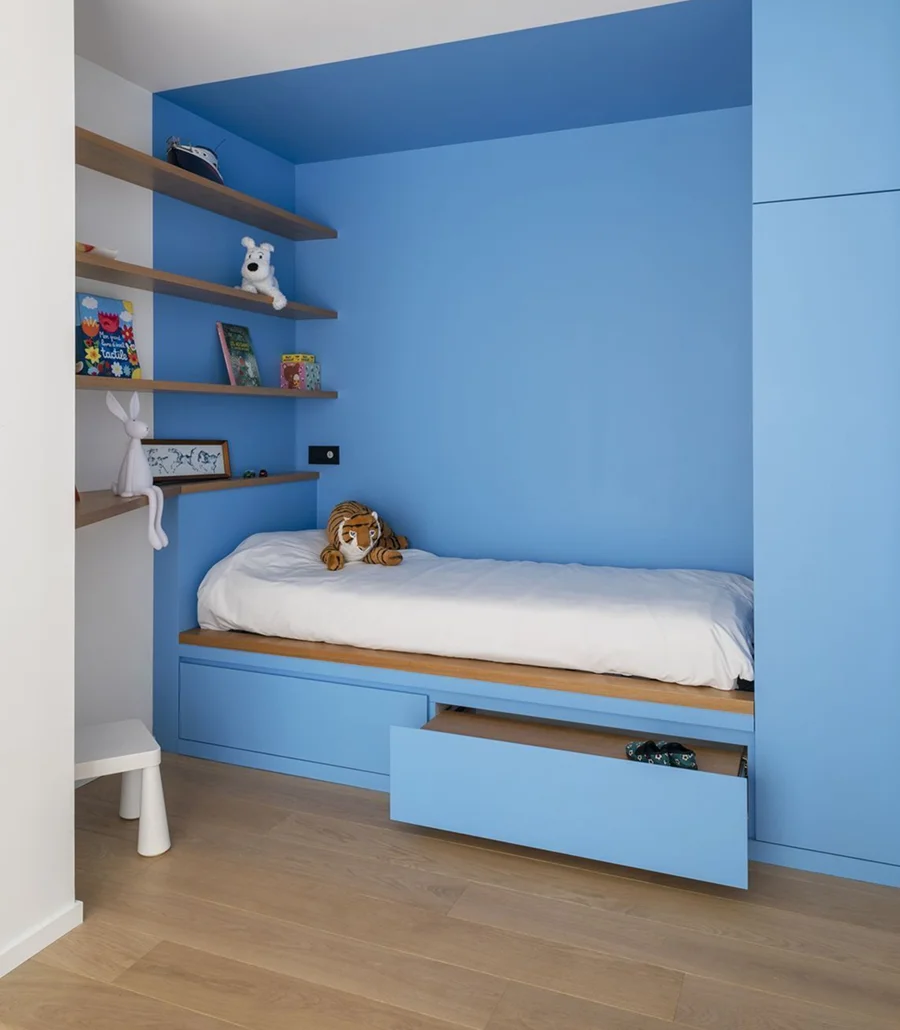 Подиум и стена вдоль него выделяются за счет яркого голубого цвета. Получился симпатичный уголок для дошкольника.
