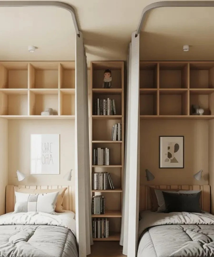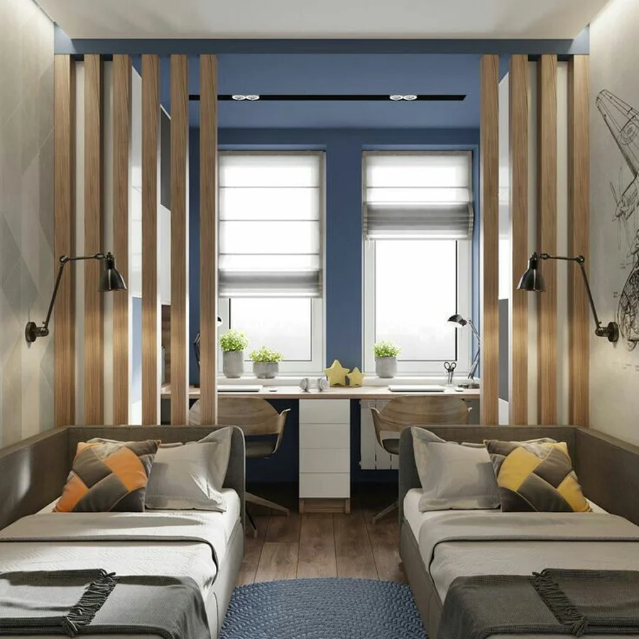 Семьям. Чтобы сохранить максимум естественного света, разделите комнату диваном или стеллажом без задней стенки. Когда ребенку исполнится 5–6 лет, добавьте плотные шторы — вам всем нужно личное пространство.