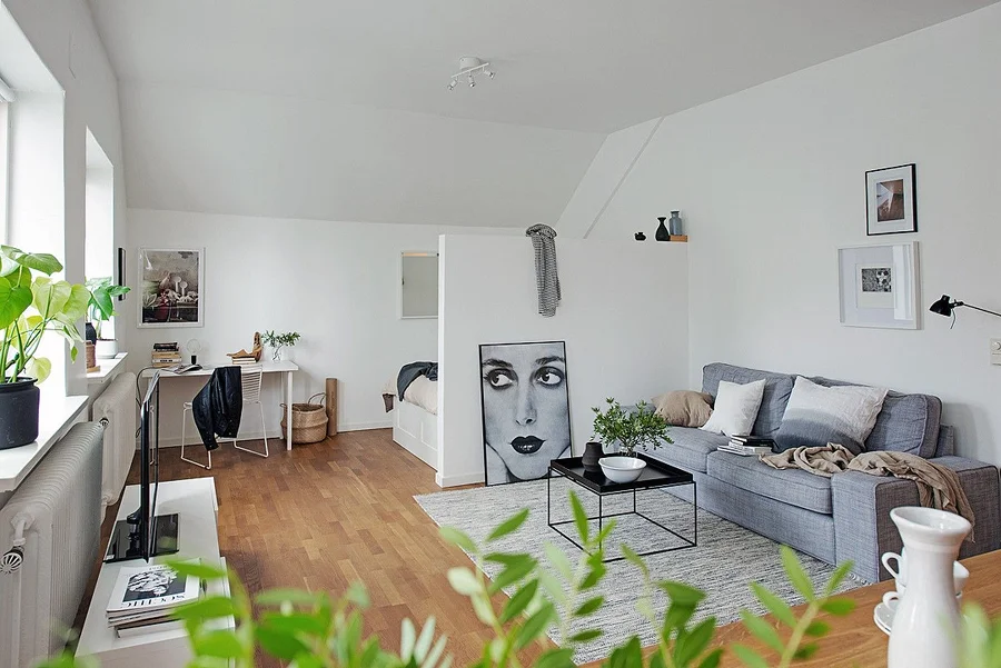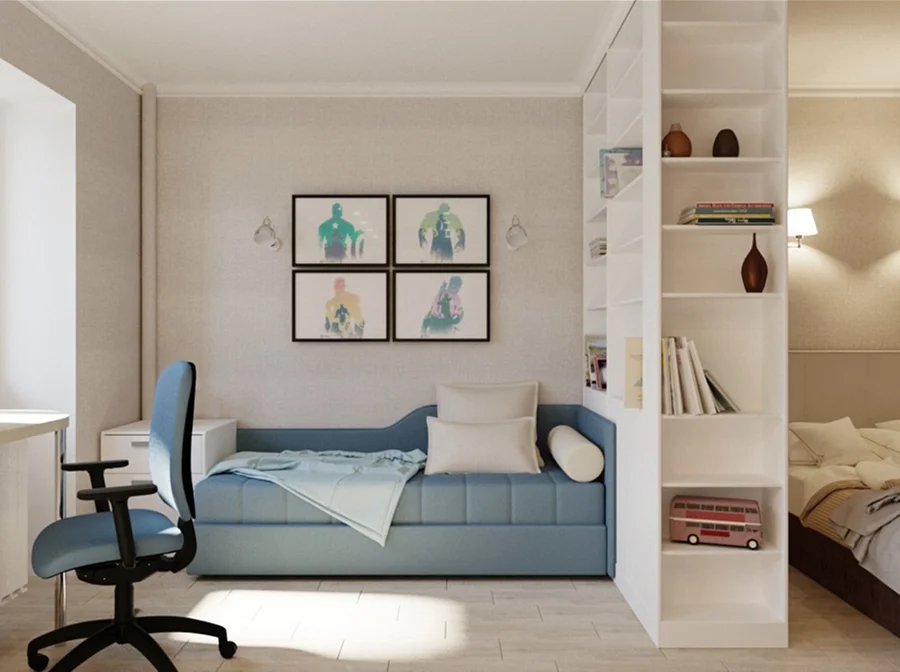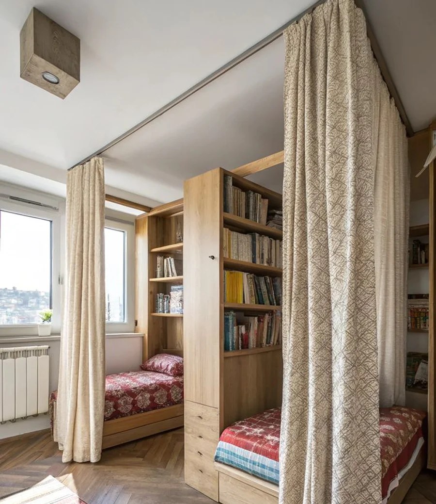 - Зонируйте пространство крупной мебелью, при желании повесьте шторы.
