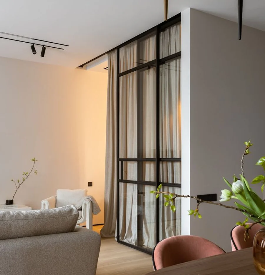 Стеклянная перегородка неплохо заглушает некоторые звуки. Ее обязательно нужно дополнить шторой, чтобы была возможность уединиться, или выбирайте рифленое стекло.