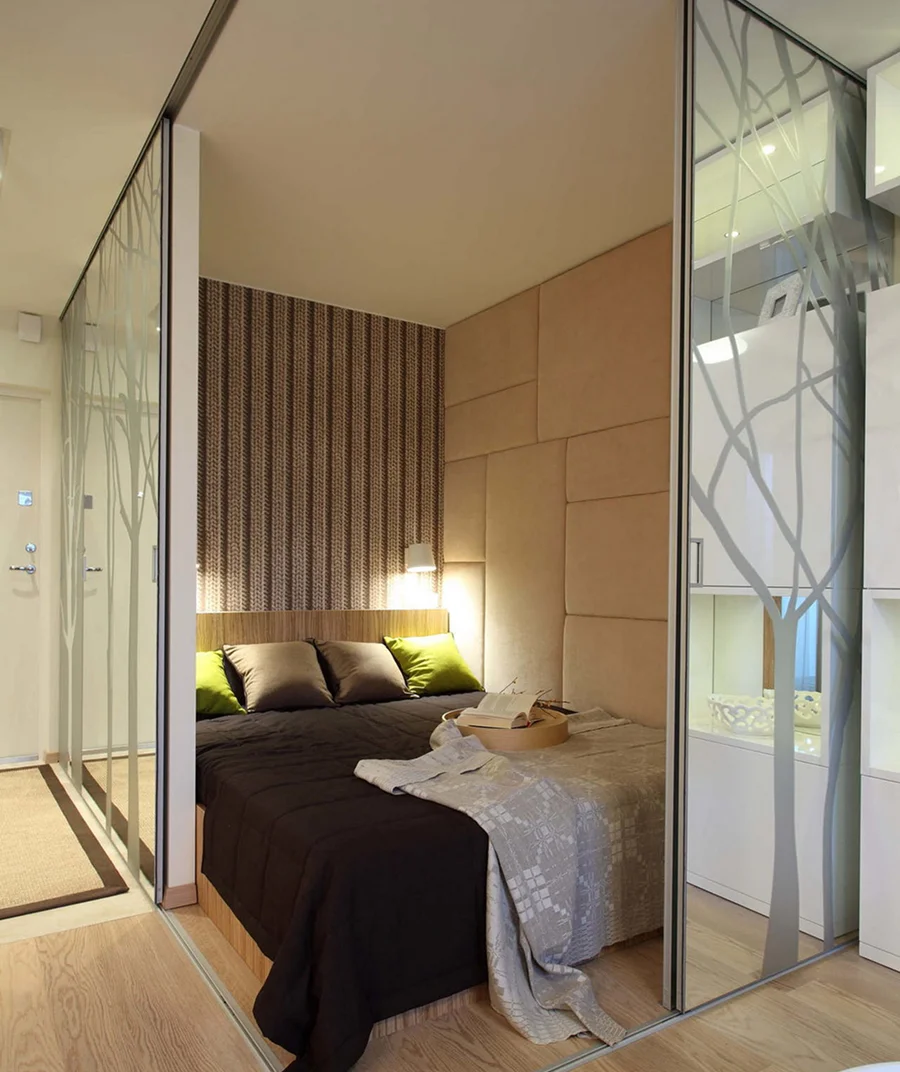 Если хочется больше приватности, используйте для зонирования гардеробный шкаф, плотные занавески или стеклянную перегородку.