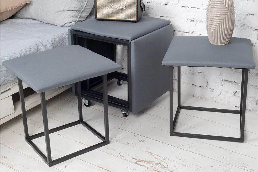 Если часто бывают гости, приобретите складные стулья, которые удобно убирать в шкаф. Тогда не придется каждый раз переставлять стол к дивану. Другим подходящим решением станет пуф, который превращается в 5 табуретов.
