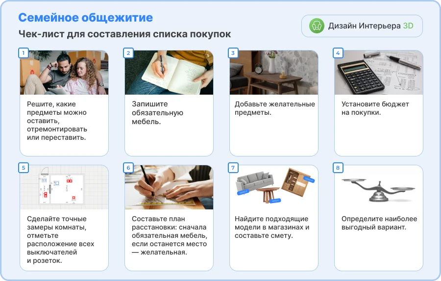Для семьи, проживающей в общежитии постоянно, наилучшей стратегией станет поэтапное преображение. Дизайн-проект поможет вам распределить бюджет и силы. Двигайтесь к продуманному наполнению, которое будет меняться вместе с потребностями членов семьи.