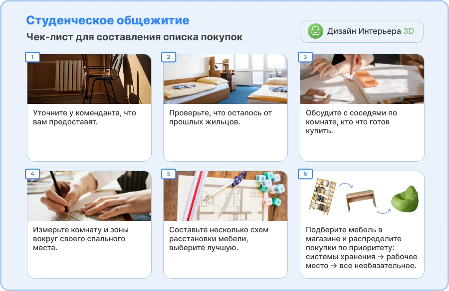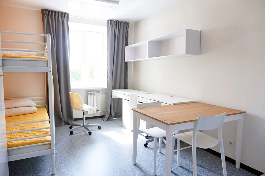 Студентам. Каждому жильцу положены кровать, стол, стул, тумбочка и полка. Гардеробный шкаф в комнате чаще всего один, в нем сложно уместить все вещи. Поэтому отдельно стоит приобрести вешалку для верхней одежды, этажерку для обуви, подвесные корзины. Замена кровати и шкафа — лишние траты, а вот рабочий стол можете приобрести более компактной модели: на маркетплейсах цена на такие решения начинается всего от 2 тысяч рублей. Еще может понадобиться холодильник.