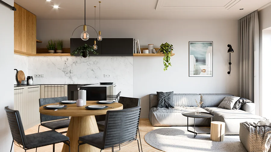 Обеденный стол отделяет место для приема пищи от уголка для отдыха или готовки.