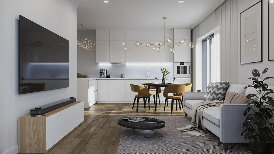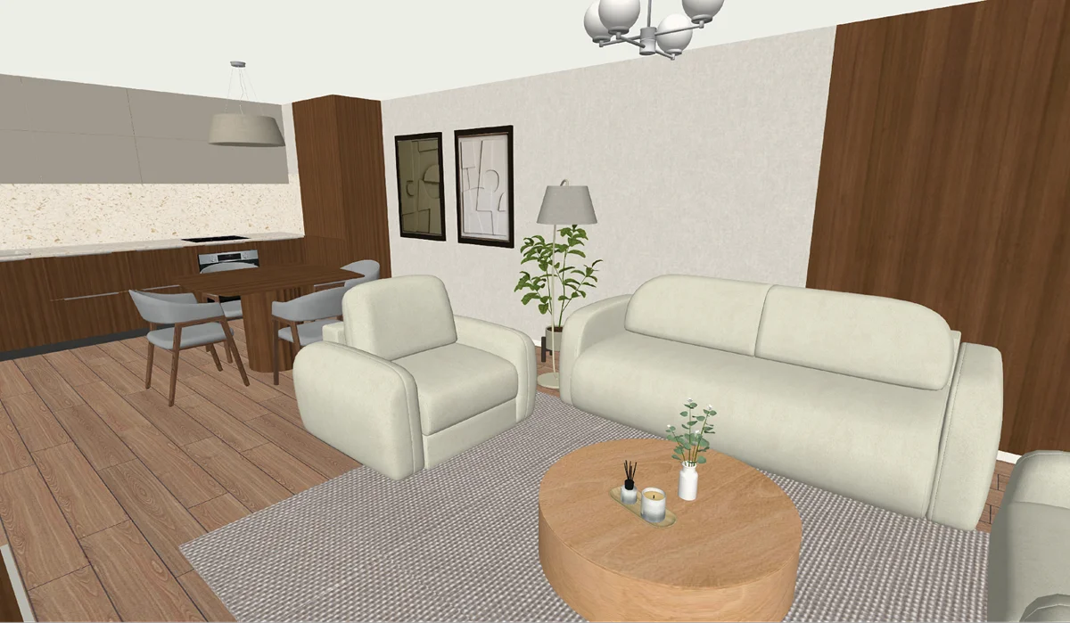 У нас получилось открытое уютное пространство с четким разделением на функциональные зоны. Готовый проект можно осмотреть в режиме 3D. А чтобы прочувствовать атмосферу, оценить удобство и эстетику, совершим виртуальную прогулку.