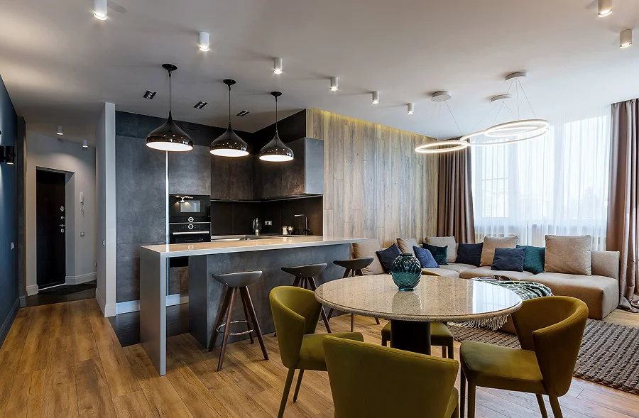Дополнительно обозначили границу между функциональными зонами реечной полуперегородкой. Она не препятствует распространению естественного света от окна в кухонную область. Во всех частях комнаты разместили оригинальные осветительные приборы.