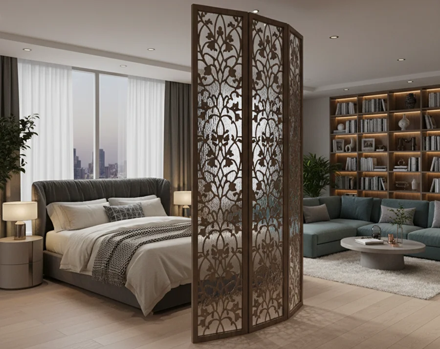 Полуперегородки и рамные модели делают из дерева, стекла, гипсокартона, металла и других материалов. Это позволяет вписать их в любой дизайн.