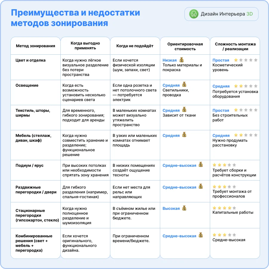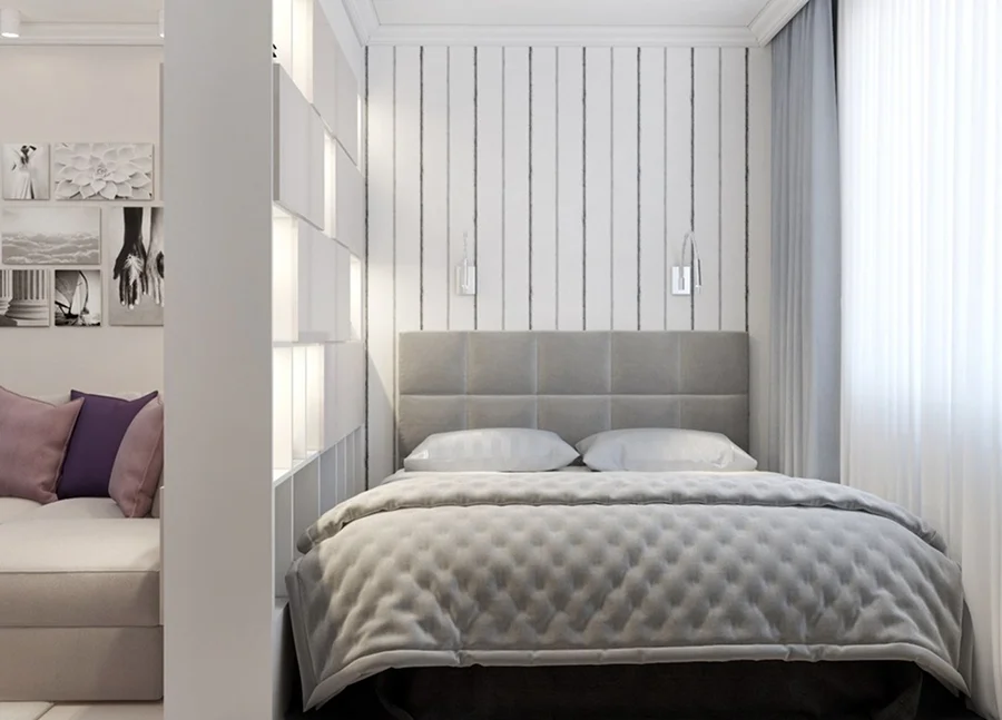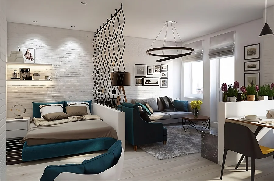 выберите способ разграничения: в небольших квартирах старайтесь использовать в качестве разделителей низкую мебель, легкие перегородки, ширмы, текстиль;