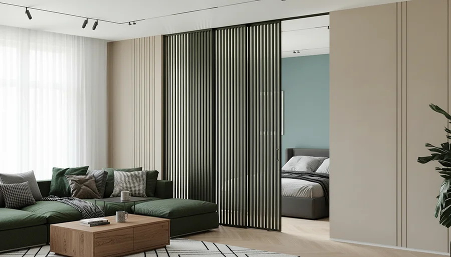 Замена стандартных дверей раздвижными или складными экономит площадь, поскольку они занимают меньше места, чем распашные модели. Решая, как разделить большую комнату на две зоны, присмотритесь к следующим типам дверей: