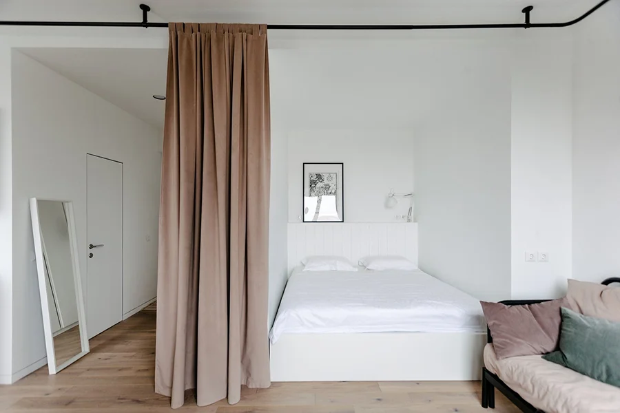 Применение текстиля – это эффектный и бюджетный способ пространственного разделения. Шторы просты в использовании, подчеркивают атмосферу домашнего уюта в квартире.