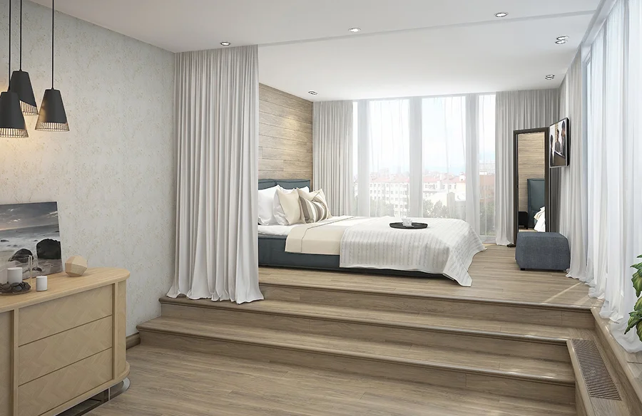 В квартире с низкими потолками сделайте невысокое (всего 15-20 см) возвышение, чтобы не создавалось давящего ощущения. Если потолки высокие, более 3,2 м, можно установить подиум высотой до 60 см со ступенями.