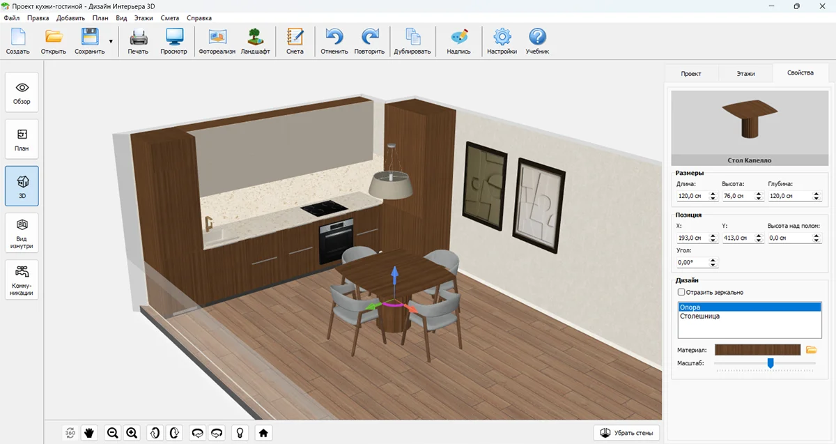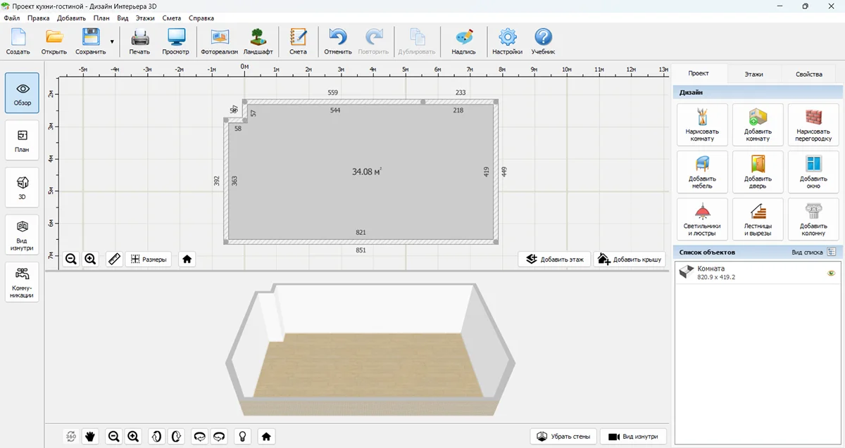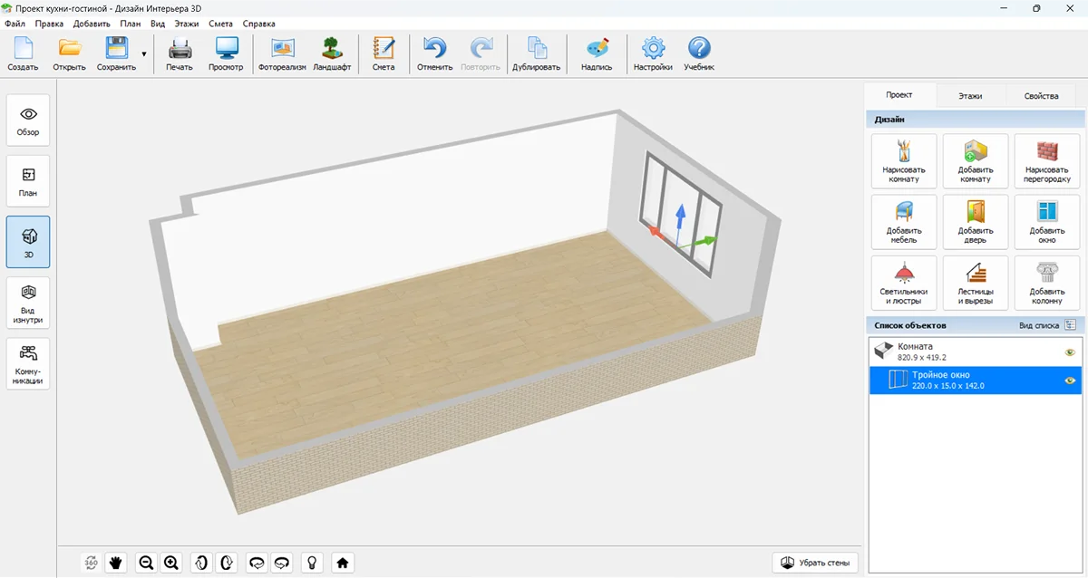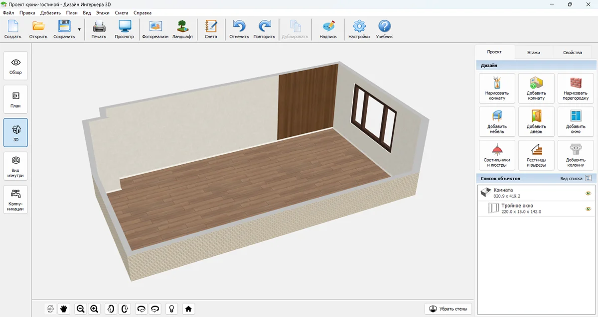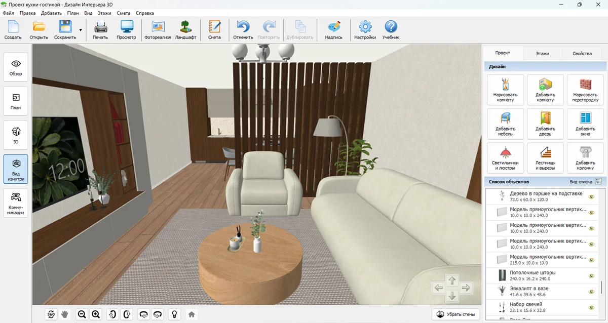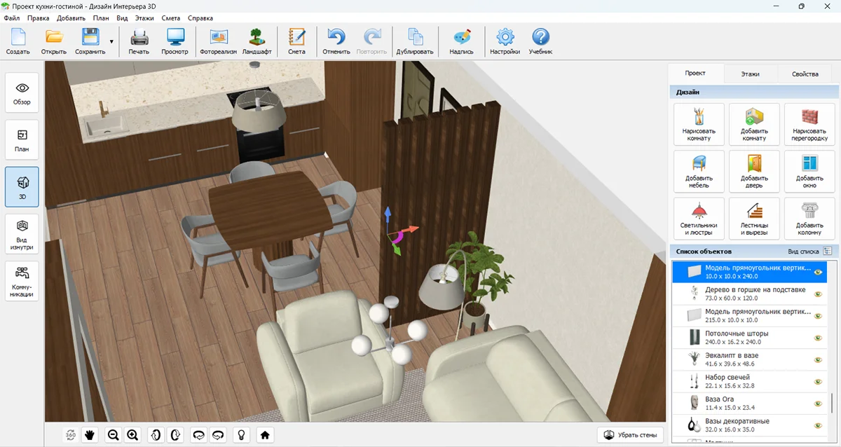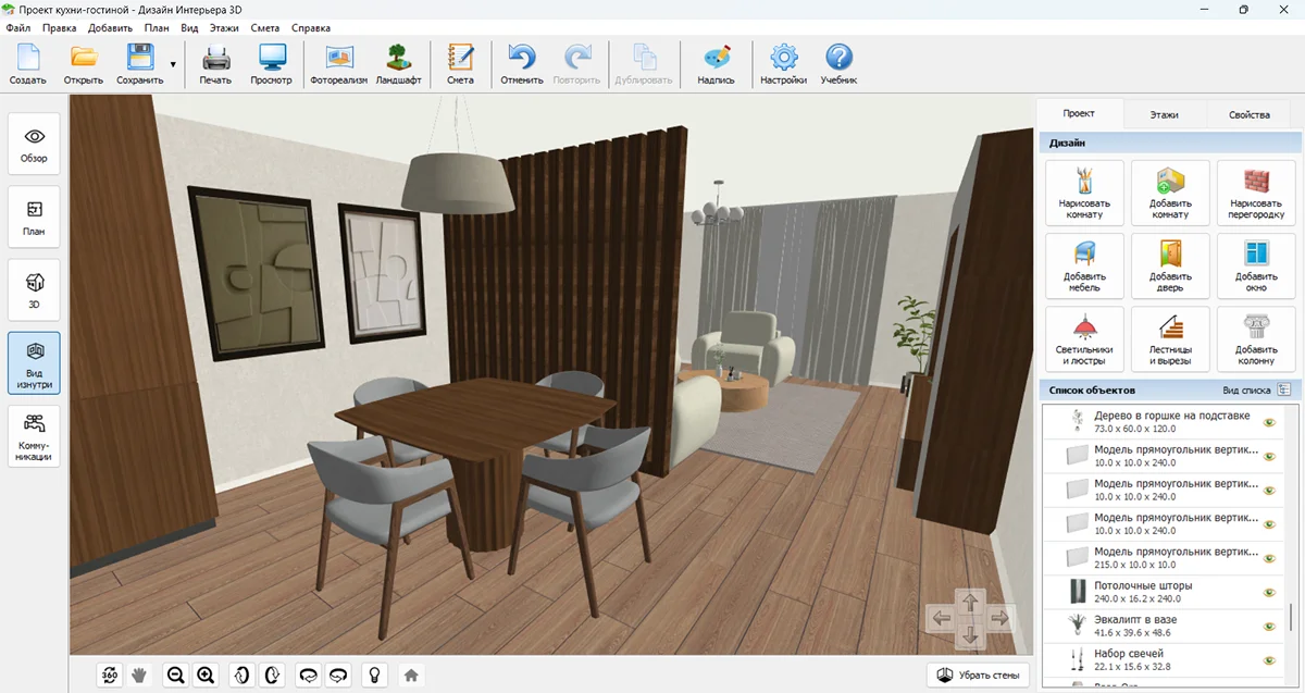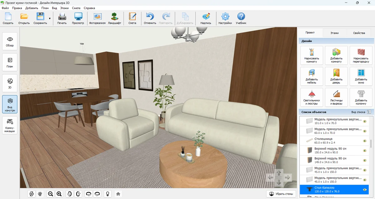 Мы рекомендуем сделать его в программе Дизайн Интерьера 3D. В каталогах приложения вы найдете всю необходимую мебель, декор и отделочные материалы, сможете поэкспериментировать с разными методами зонирования. Результат удобно оценивать в режиме 3D или виртуальной прогулки. Рассмотрим пошагово, как разработать с помощью софта обстановку кухни-гостиной.
