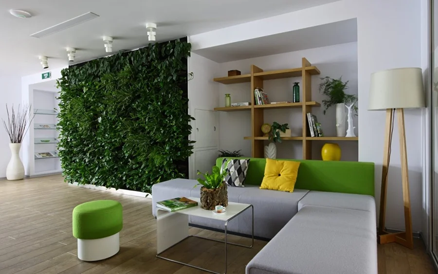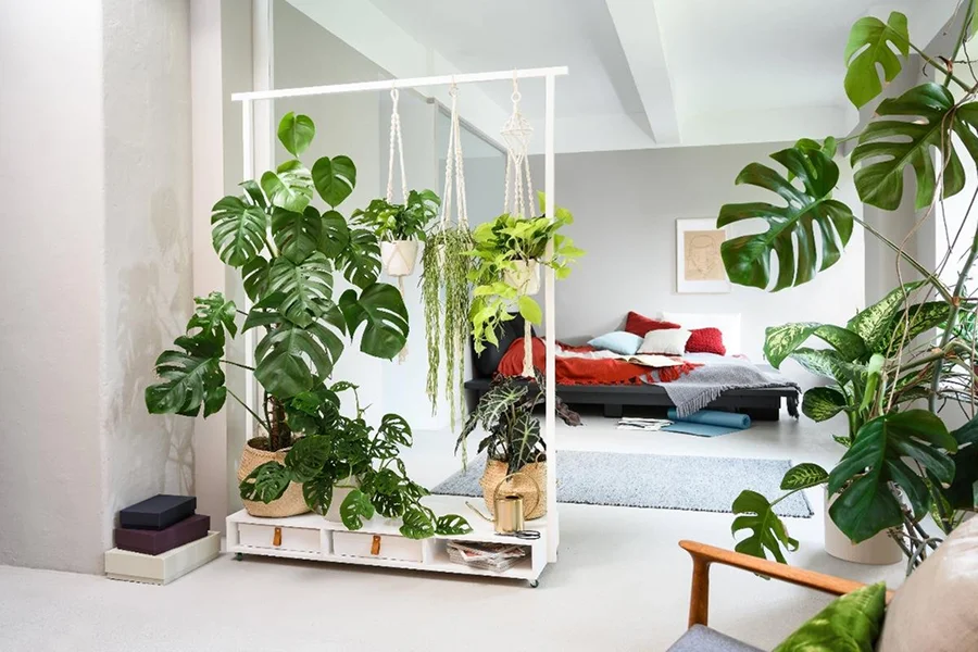 комнатные растения – можно сделать живую изгородь, разделив помещение стеллажами с цветами, либо обозначить границы высокими растениями;
