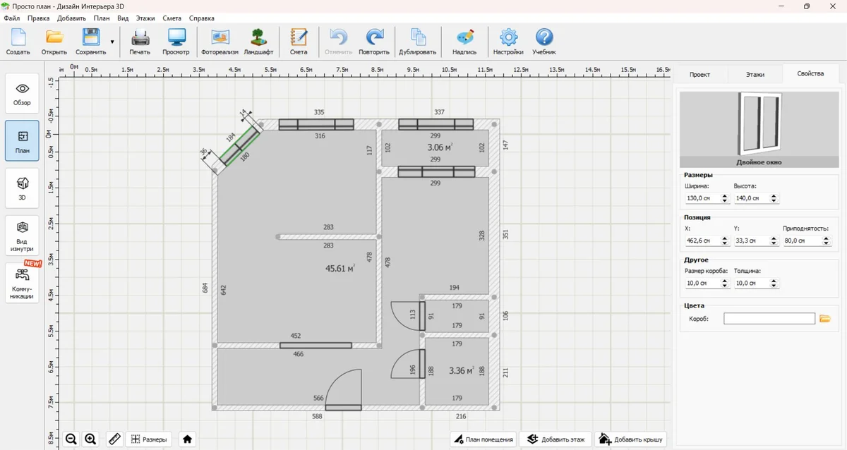 В Дизайн Интерьера 3D нарисовать план с окнами и дверями сможет даже новичок. Разработчики встроили подсказки, чтобы вам было проще разобраться. Вы сможете выставить и проверить все размеры.