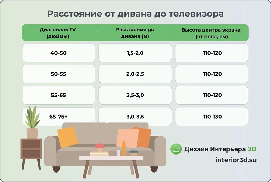 Когда мягкая мебель расставлена, определите место и высоту размещения телевизора, чтобы экран оказался на уровне глаз. В таблице ниже мы приводим рекомендации по оптимальному расстоянию для просмотра в зависимости от диагонали экрана.