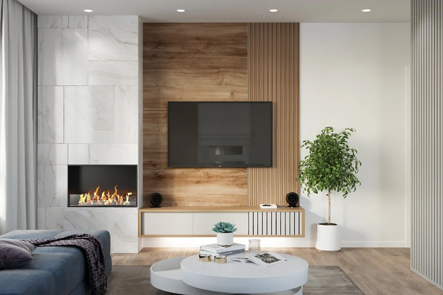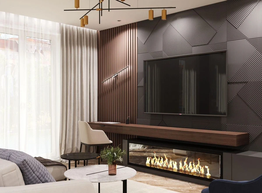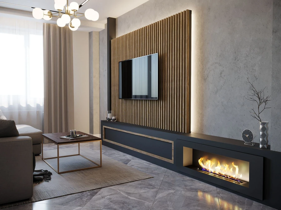 Биокамин — отличный вариант для тех, кто хочет создать в городской квартире уютную атмосферу загородного коттеджа. Такие камины не требуют установки дымохода, не коптят, поэтому допустимы в многоквартирных домах. Особенно приятно совместить семейный вечер у огня с просмотром любимого фильма. Поэтому эти элементы хорошо устанавливать рядом.