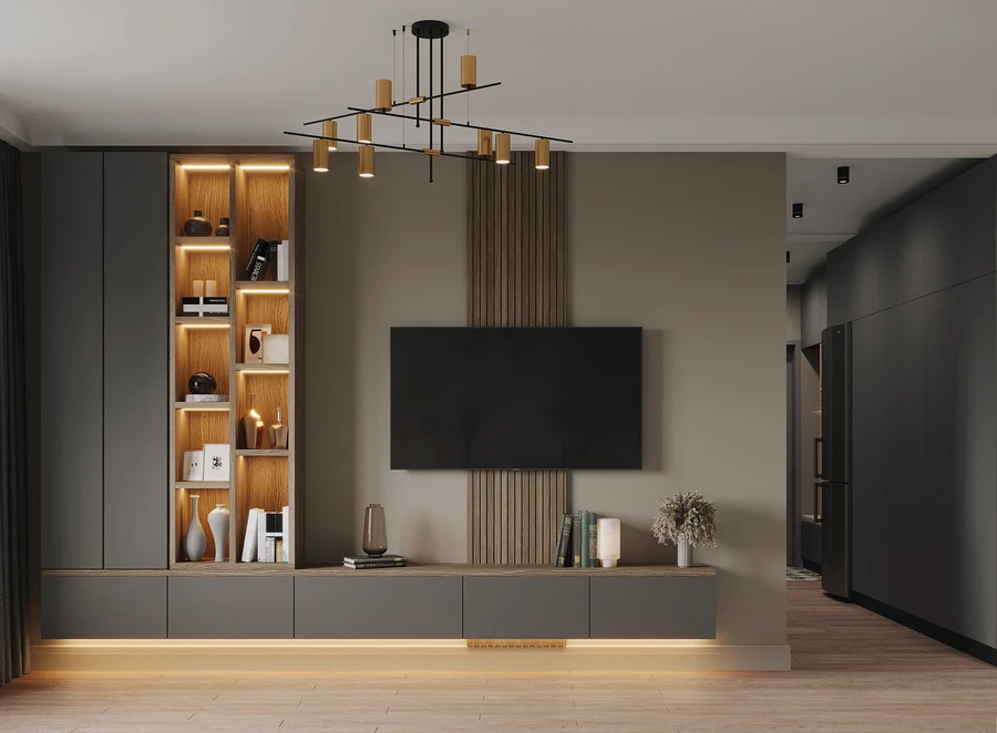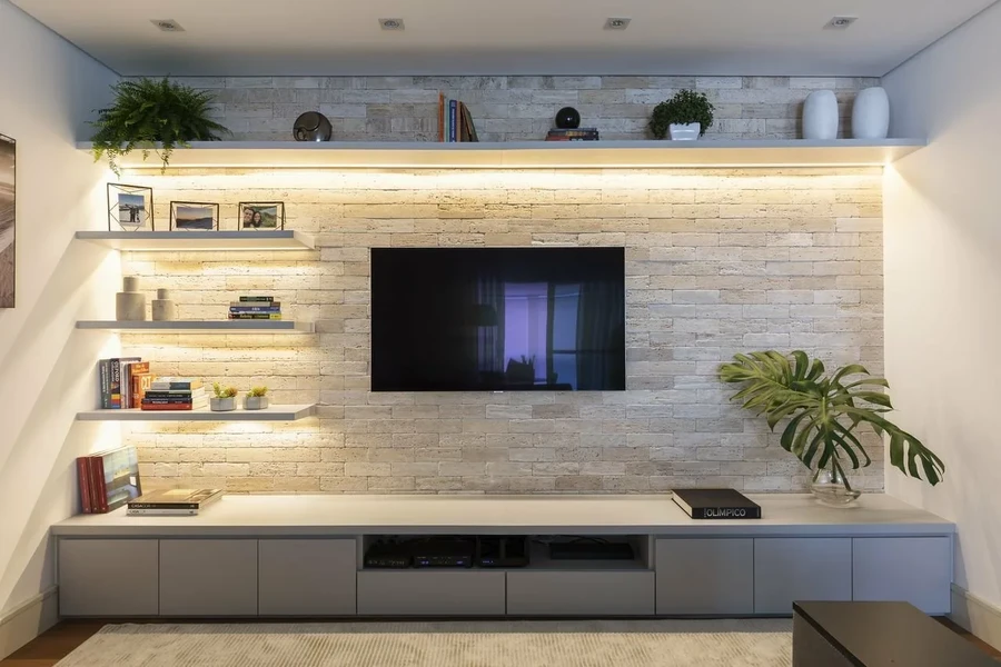 Для организации скрытой подсветки чаще используют встроенные LED-линии. Их можно установить за телевизором, по периметру ТВ-стены, чтобы подчеркнуть зонирование, или по краям ниши, куда техника встроена.
