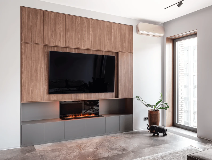 Скрытый монтаж дороже и сложнее. Чтобы спрятать телевизор, необходимо оборудовать нишу с раздвижными панелями или шкаф-купе. Тумбу придется оснастить специальным выдвижным механизмом. Также следует обеспечить вентиляцию внутри закрытой системы, чтобы техника не перегревалась.
