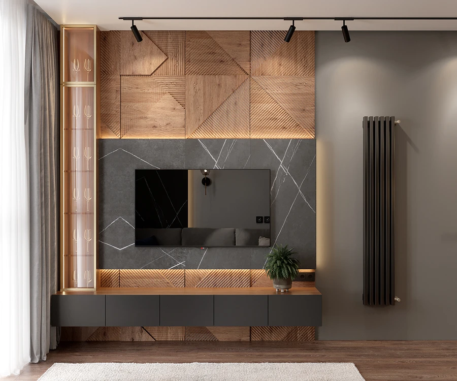 - Приступайте к проектированию ТВ-зоны. Подберите подходящий телевизор и определитесь с оформлением стены вокруг экрана: «примерьте» кирпичную кладку и вертикальные рейки, сделайте стильное панно из керамогранита.