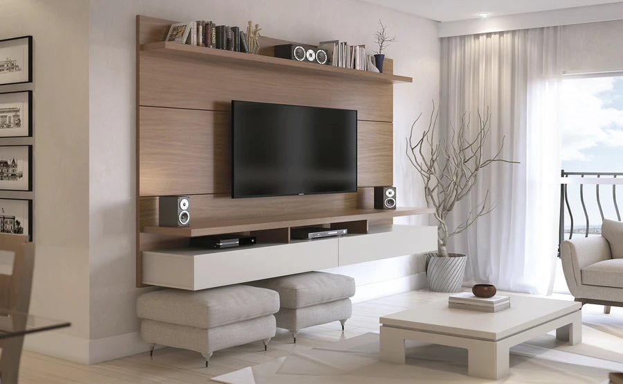 - удобные системы хранения — на подвесной полке хорошо держать пульты, дополнительную технику, аксессуары или декоративные украшения.