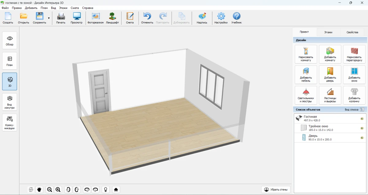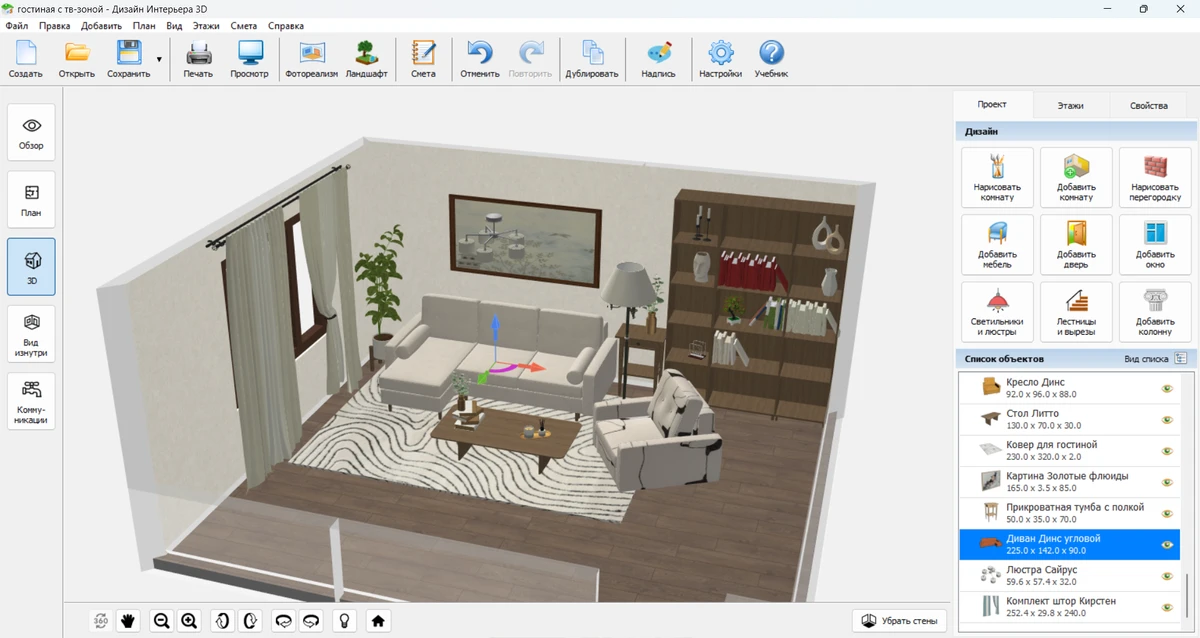 Чтобы избежать ошибок и переделок, создайте проект в специальной программе. Это поможет заранее представить, насколько хорошо выбранный дизайн сочетается с общей обстановкой и формой комнаты. Мы сделали макет в программе Дизайн Интерьера 3D. В ней есть все необходимое для любых комнат.