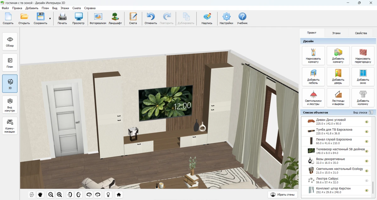 Декор выбирайте, исходя из размера и общего стиля помещения. Перед тем, как оформлять стену с телевизором в гостиной, создайте проект в программе Дизайн Интерьера 3D. Он поможет до начала ремонта понять, насколько красивой и эргономичной получилась комната.
