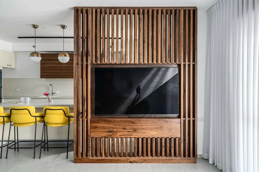 Один из трендов сезона. Рейки подходят для современного дизайна гостиной, хорошо вписываются в общее пространство в стилях сканди, эко, лофт.