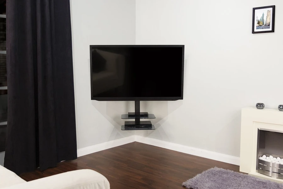- Для узкой и длинной комнаты подойдет угловое размещение экрана на кронштейне или его установка у короткой стены — это скорректирует пространство.