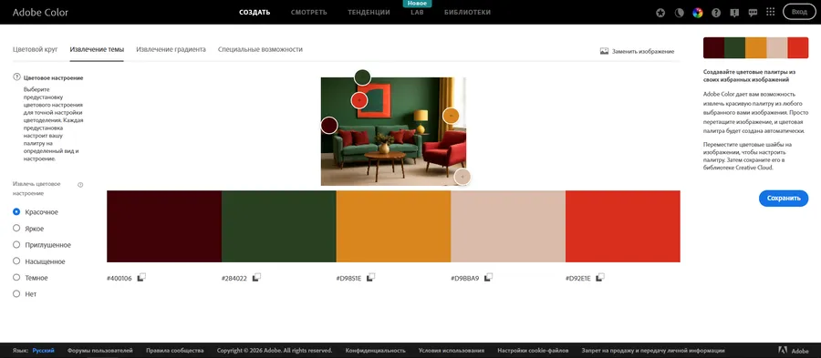 Помимо этого, тут есть функция, существенно упрощающая сам подбор цвета стен онлайн. Перейдя в раздел «Извлечь из изображения» и загрузив фото понравившейся комнаты, вы получите готовую палитру из основных цветов снимка. Полученные цвета можно корректировать по тону и яркости, адаптируя их под свои задачи. Если исходный выбор программы не понравился, просто перемещайте кружки по изображению, пока не найдете подходящую вам комбинацию.