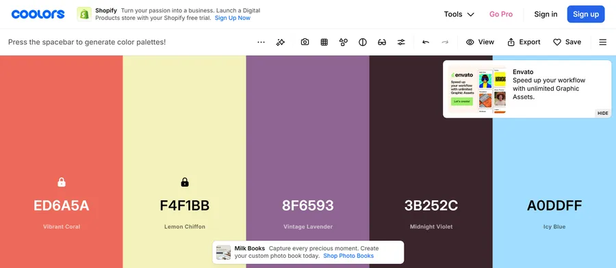 При каждом нажатии пробела сервис генерирует новую комбинацию из пяти оттенков. Предположим, вы хотите интерьер в белом цвете. Тогда зафиксируйте нужный колер значком замка. Дальше сервис будет подбирать сочетания только с его участием. Такой метод позволяет находить комбинации, которые редко приходят в голову при самостоятельном подборе. Готовую палитру можно скачать в виде изображения, а также сохранить по ссылке для дальнейшей работы.