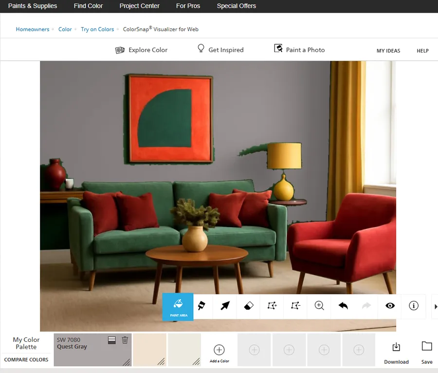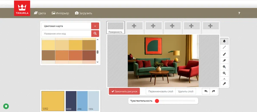 Этот сервис не просто выполняет подбор цвета для интерьера онлайн, но и позволяет редактировать имеющиеся фотографии. Достаточно нажать на нужную поверхность и выбрать оттенок из каталога, чтобы увидеть, как он будет выглядеть в комнате.