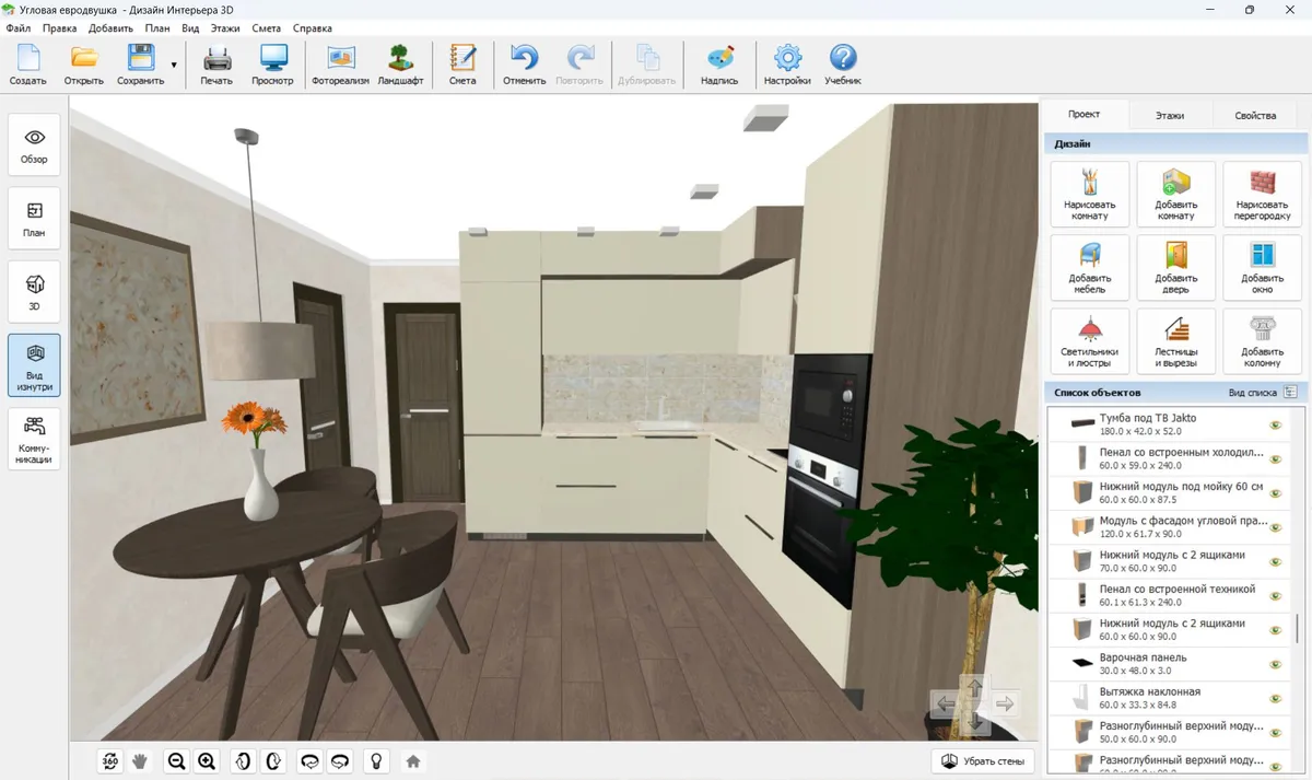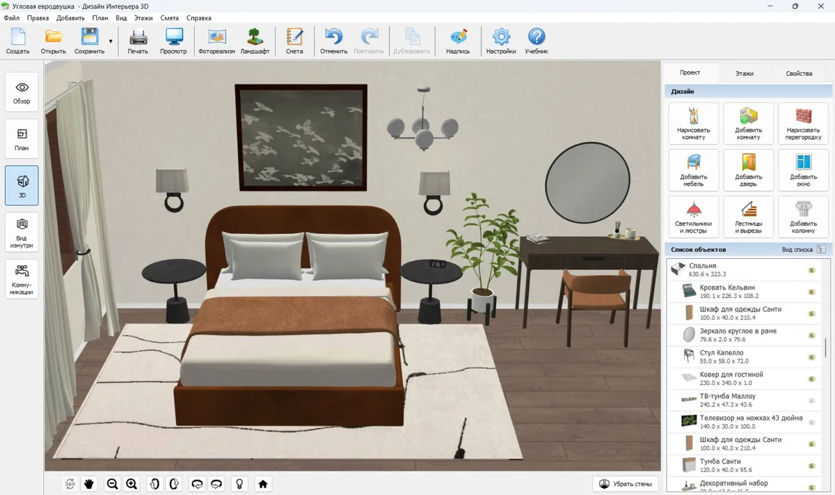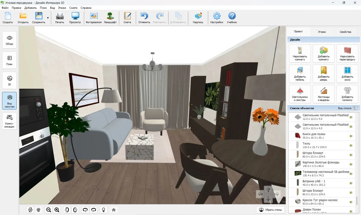 Если нужно визуализировать масштабные изменения в квартире, простых сервисов может быть недостаточно. Описанные ранее утилиты позволяют только немного поправить существующий интерьер, но не переделать его полностью. В них нельзя разработать план меблировки, продумать ширину проходов или сравнить несколько разных моделей диванов. Для таких задач нужен полноценный планировщик, например Дизайн Интерьера 3D.