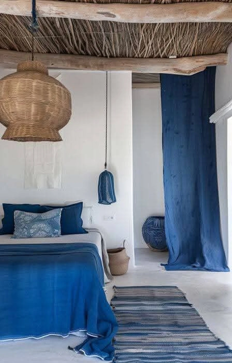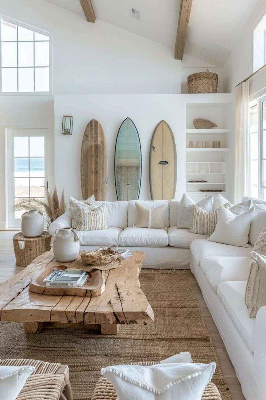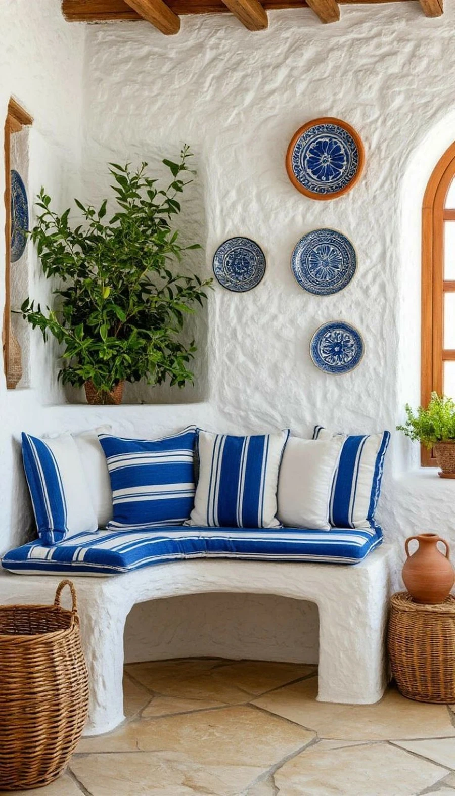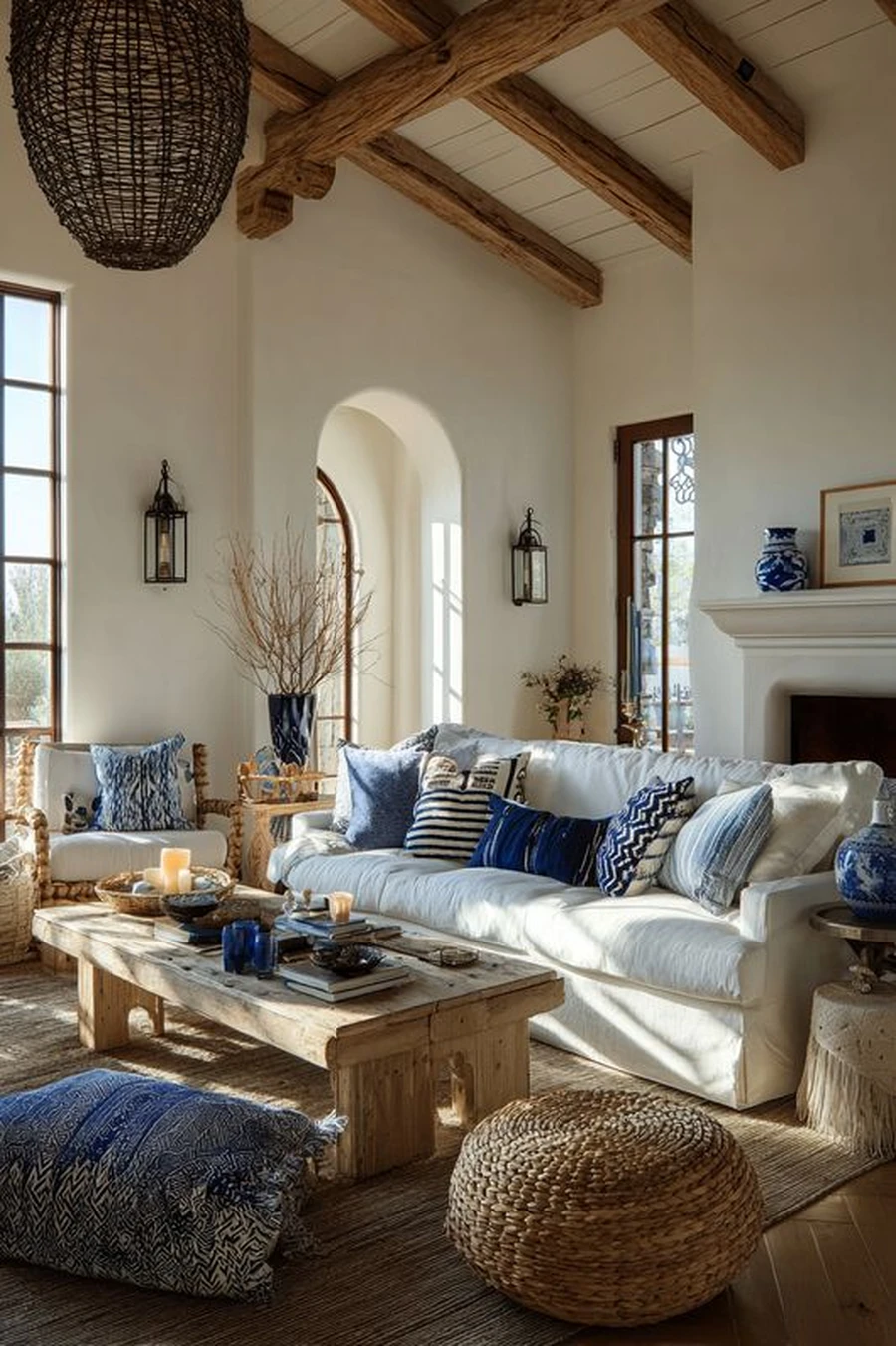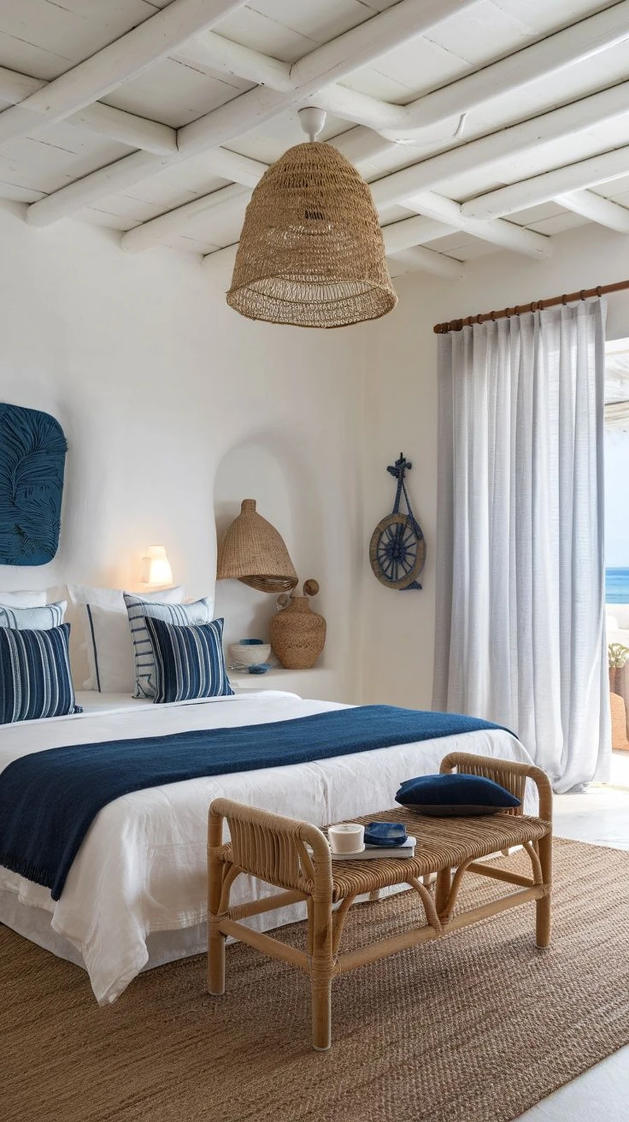 Для украшения подойдут вязаные пледы, шерстяные пушистые коврики, светильники с тканевыми абажурами. Возможно, дома лежат ракушки, привезенные с моря — используйте их в декоре. Походите по магазинам, поищите глиняные цветочные горшочки с подходящим орнаментом, плетеные корзиночки, морские панно и прочее.