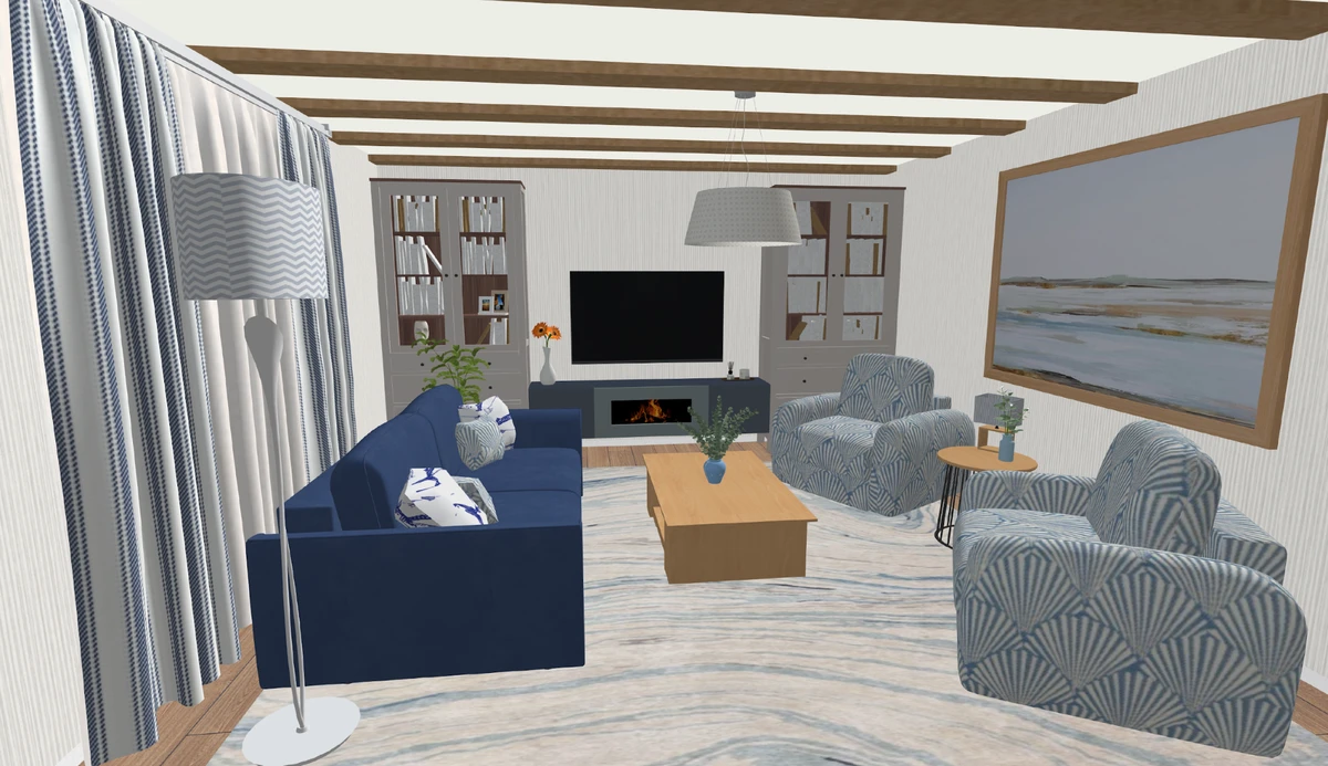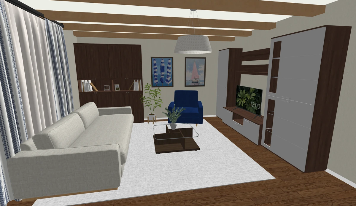Мы для примера решили оформить гостиную. Взяли за основу бело-синюю оттеночную палитру, украсили потолок традиционными для направления балками, максимально освободили пространство. Но обстановка в комнате получилась темной, несмотря на характерные для стилистики детали.