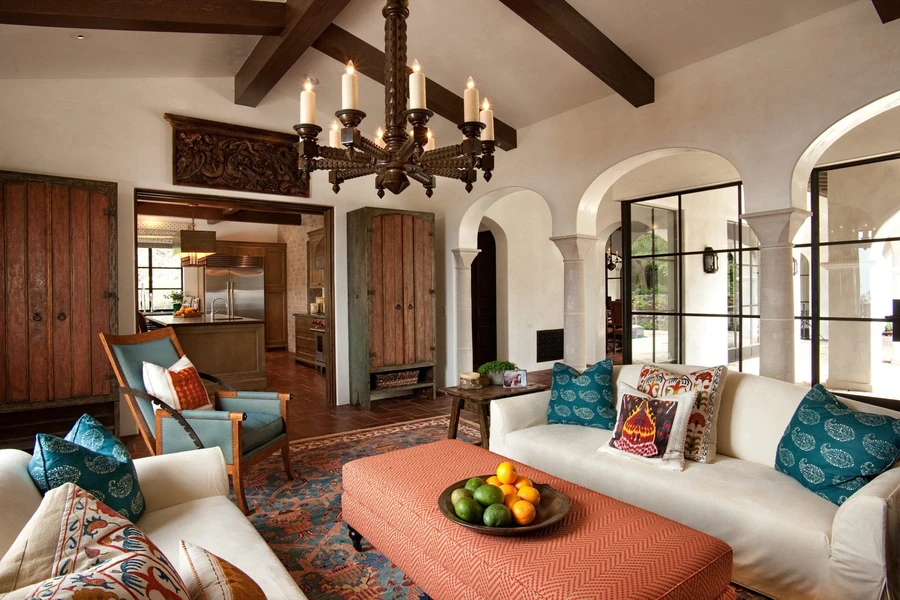 - Испанский. Более теплый, яркий вариант. Здесь подтона белого, бежевые, кофейные оттенки гармонично сочетаются с красным, желтым, терракотовым, оранжевым цветами. Мебель выглядит массивной, с коваными или резными деталями. Характерным элементом испанского стиля является камин. Авторские вазы, подсвечники, статуэтки и тарелки из керамики размещают на открытых полках или в шкафчиках со стеклянными фасадами.