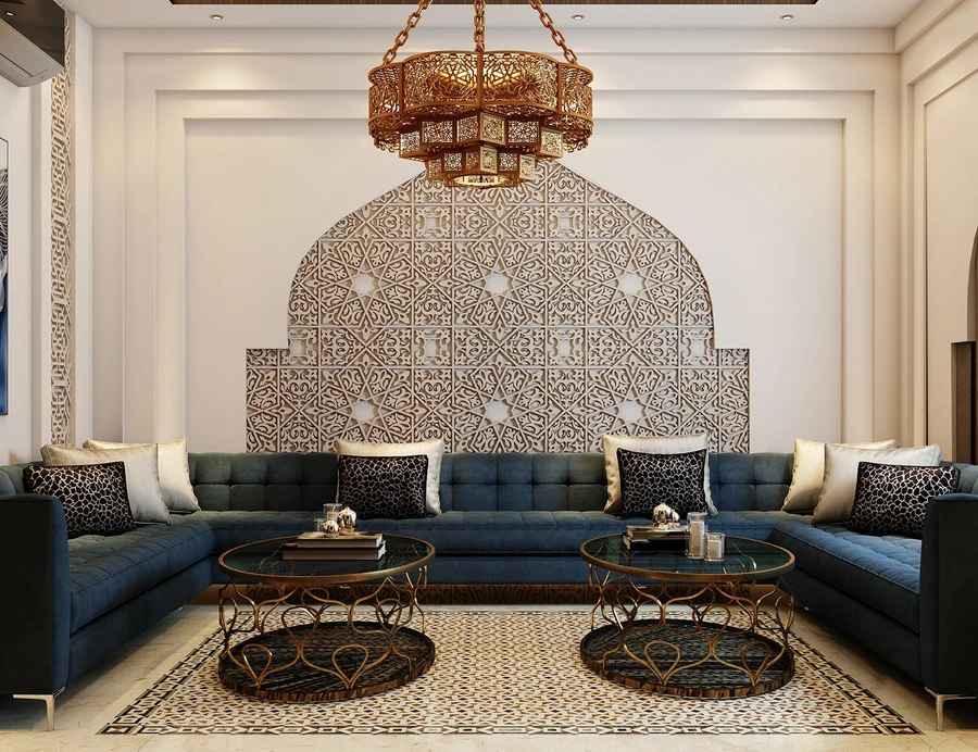 - Арабский. Этому дизайну свойственна насыщенная палитра с добавлением золотистых, фиолетовых, оранжевых тонов. Стены часто оформляют плиткой с восточным орнаментом, ажурными нишами, фресками, мозаикой. Используют витиеватые перегородки, позолоченные детали, изящную мебель, ковры, яркие подушечки. От традиционных восточных направлений стилистика отличается меньшей пестротой, добавлением большего количества светлых тонов.