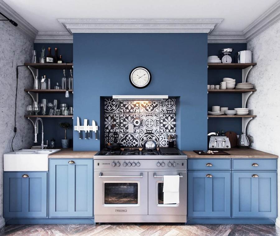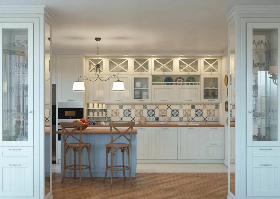 Кухонное пространство символизирует дань традициям. Гарнитур следует выбрать деревянный с фасадами простой формы. Часто в стилистике используются предметы из состаренного дерева. Фартук хорошо отделать плиткой с узорами традиционных ярких оттенков: синими, терракотовыми, желтыми и другими.