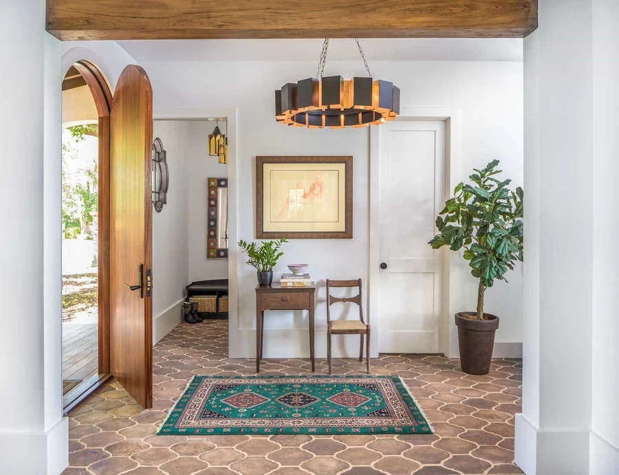 Прихожую в идеале нужно сделать как можно просторнее, освободив от всего лишнего. Для отделки стен хорошо использовать светлую рельефную штукатурку либо краску. Характерный для стилистики камень и керамическая плитка благодаря износостойкости и долговечности подойдут для оформления пола в коридоре.